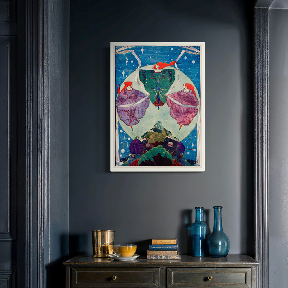 Dancing Under MoonlightThree elfin women float in a celestial dance, draped in jewel tones and bathed in moonlight.