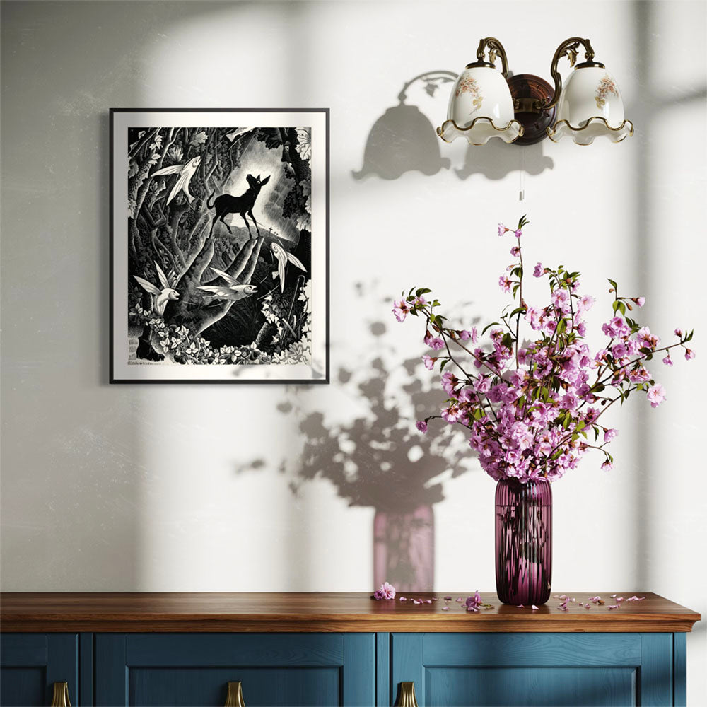 The DonkeyA surreal 1930s print where a poised donkey, flying fish, and shadowy forest create a quietly mysterious scene.