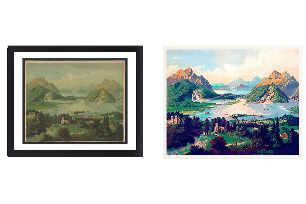 Our version: This print, depicting lakes amid the lush Irish countryside with castles, greenery, and pathways, has been repaired and color corrected to highlight its vivid hues. The sky's details were carefully restored, and a slim white frame was chosen to allow the artwork to take center stage.