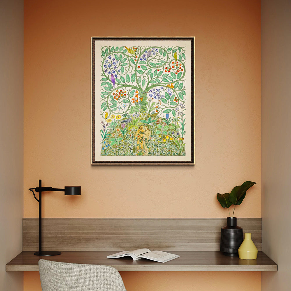 The artwork is compelling for its "sensorial design"—a characteristic of C.F.A. Voysey’s work that favors clarity and two-dimensional honesty over traditional shading. The composition utilizes a masterfully handled "solid and void" technique, where the white background is as much a deliberate shape as the subjects themselves. We specifically noted the use of arbitrary scale; the oversized lilies and rhythmic repetition of the star-shaped flowers lend the piece a naive charm reminiscent of medieval tapestries. The color story is particularly sophisticated, offering an earthy, biophilic aesthetic that bridges the gap between historic illustration and modern minimalist decor.