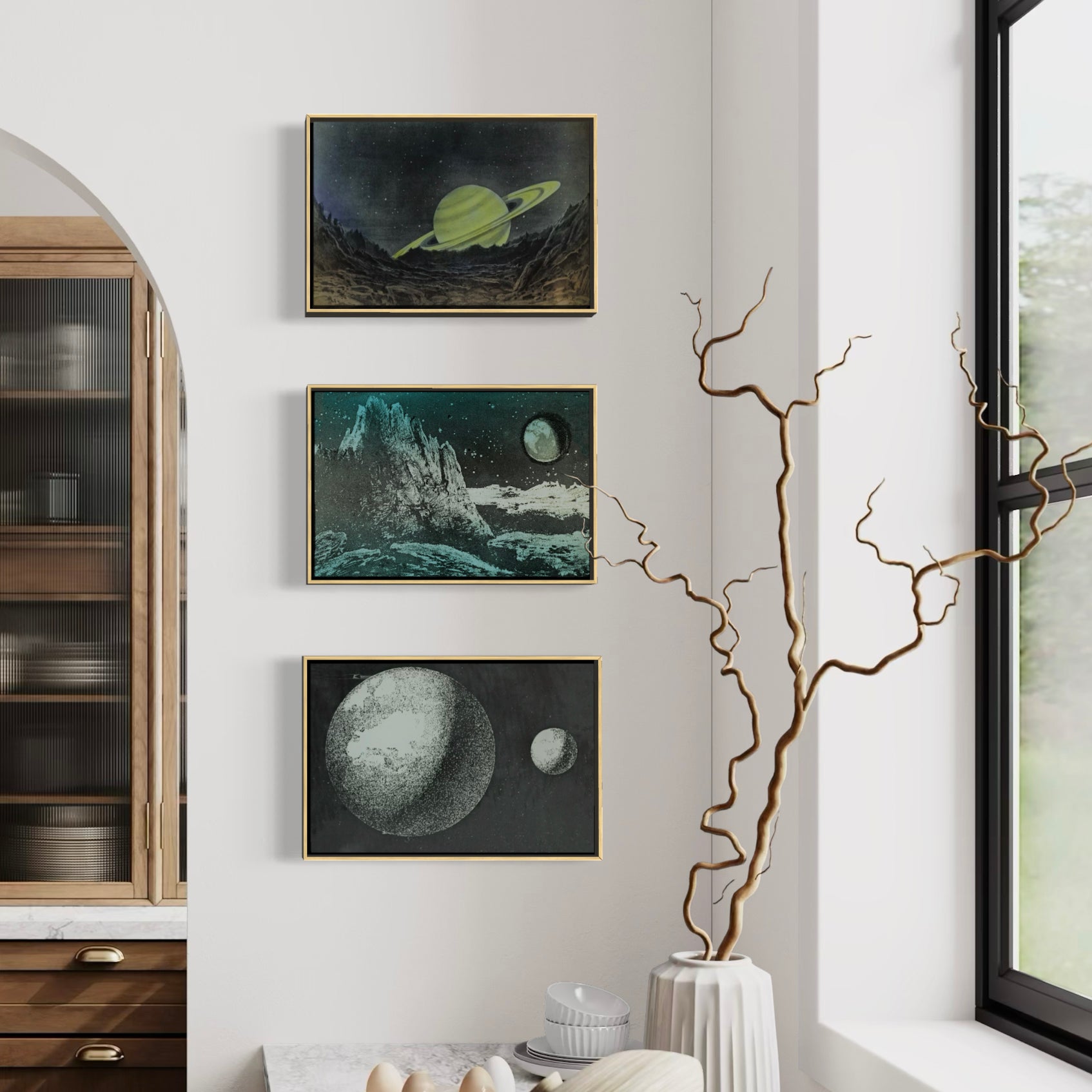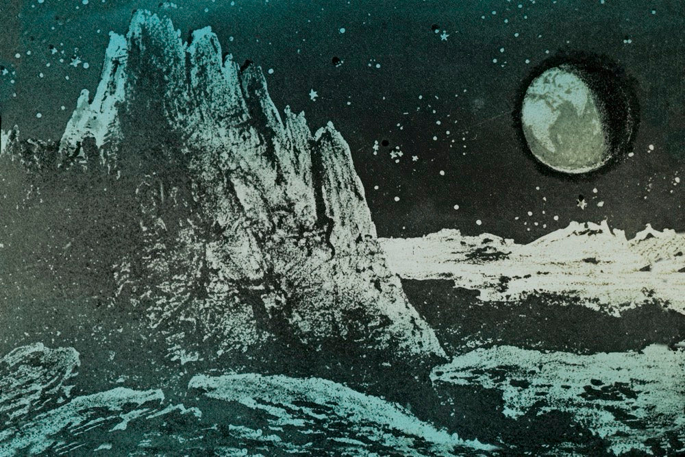 This collection presents a series of high-contrast celestial and atmospheric studies, each captured through a circular aperture that replicates the view of a 19th-century telescope or Magic Lantern projector. The imagery ranges from the jagged, monochromatic topography of the lunar surface to the erratic, skeletal energy of lightning strikes and the hand-tinted solar corona. Each piece serves as a silent, scientific witness to natural phenomena, offering a viewing experience that balances clinical observation with a deeply contemplative, archival mood.
