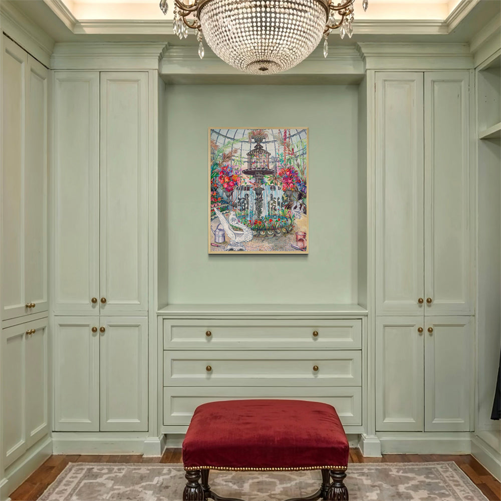 A watercolor composition of a lush, vibrant conservatory where a grand fountain takes center stage. The water cascading over intricate ironwork contrasts with the riot of flowers. It is a snapshot of a world where nature and architecture coexist contributing to a calm, serene atmosphere.