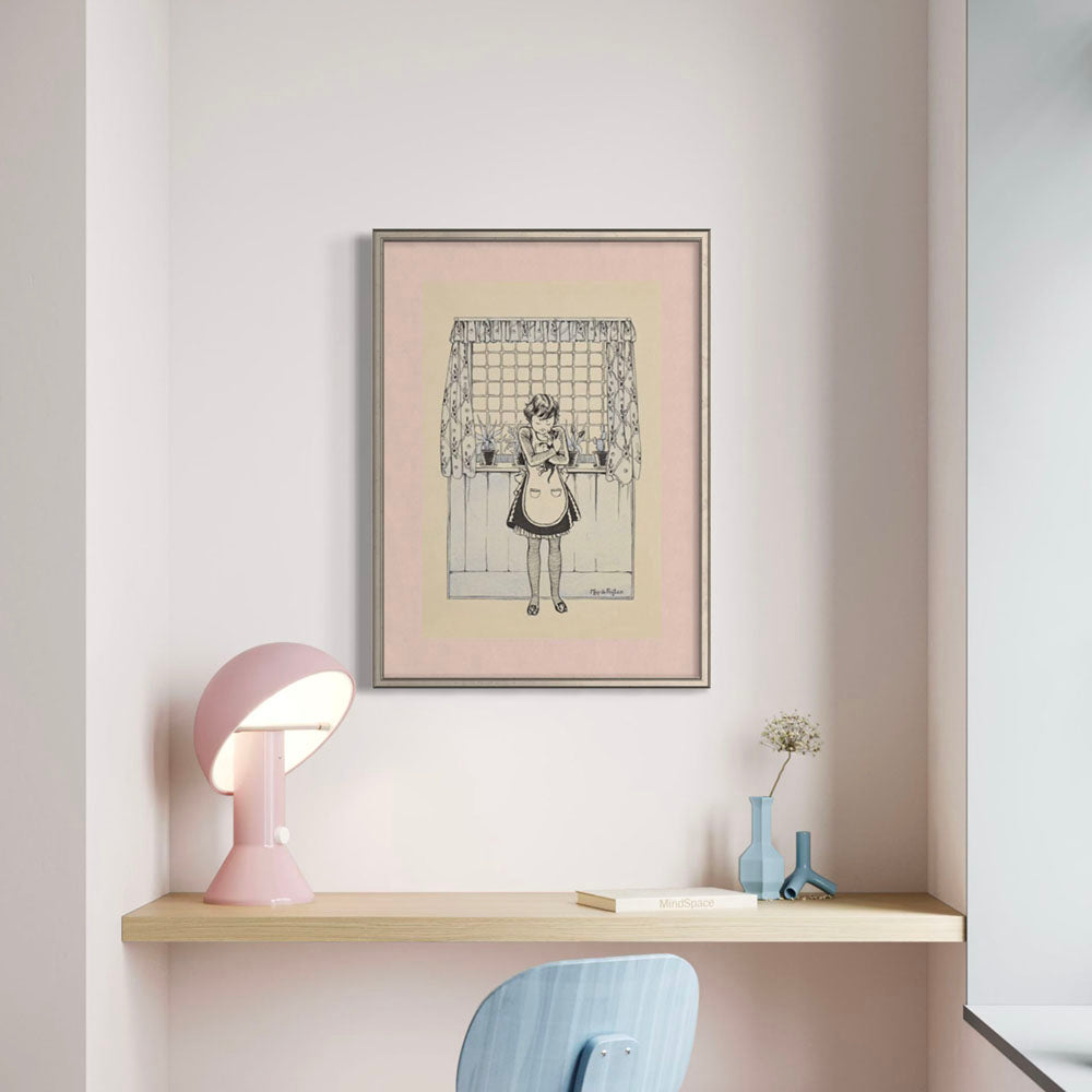 This 1930s illustration presents a quiet, intimate moment of childhood affection. The composition centers on a young girl cradling a cat against her chest, set against the structured backdrop of a gridded window and a rhythmic row of potted plants. Executed with a delicate balance of India ink and soft blue washes, the piece evokes a sense of stillness and domestic warmth common in the interwar period of Dutch illustration.
