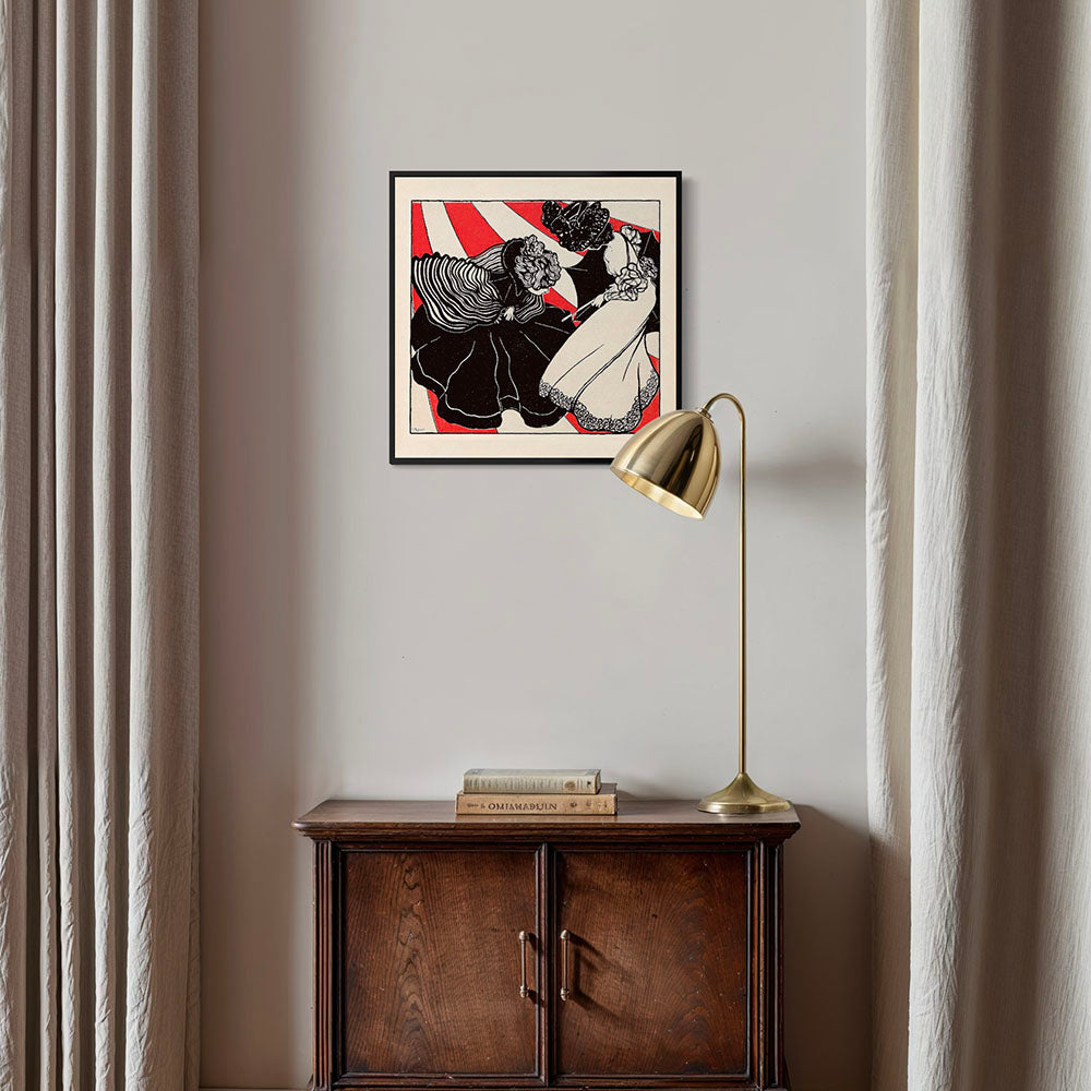 This striking graphic illustration presents a stylized encounter between two women, rendered with the bold, rhythmic precision characteristic of the Secessionist movement. The composition is defined by a high-contrast palette of deep black, crisp white, and a vibrant, striped red background that adds a sense of theatrical urgency to the scene. The figures are captured in a moment of formal grace, their flowing, patterned garments creating a fluid sense of motion that contrasts with the sharp, geometric lines of the environment.