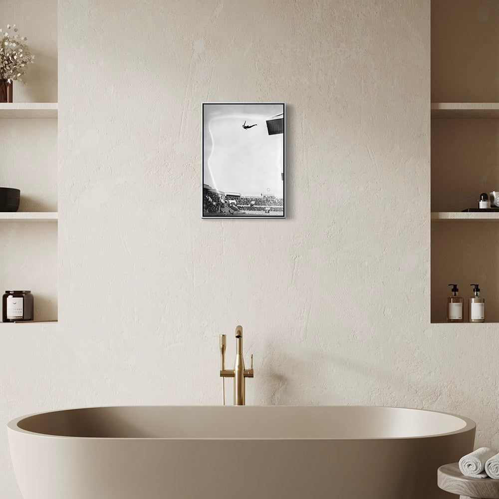 The appeal lies in how the photograph balances minimalism and intensity. The diver’s silhouette is crisp against an almost empty sky, creating a sculptural effect. The stadium architecture and the mass of spectators anchor the scene without overwhelming it. The slight photographic imperfections, likely due to early news-press processing, add an authentic archival character that deepens the image’s visual interest.