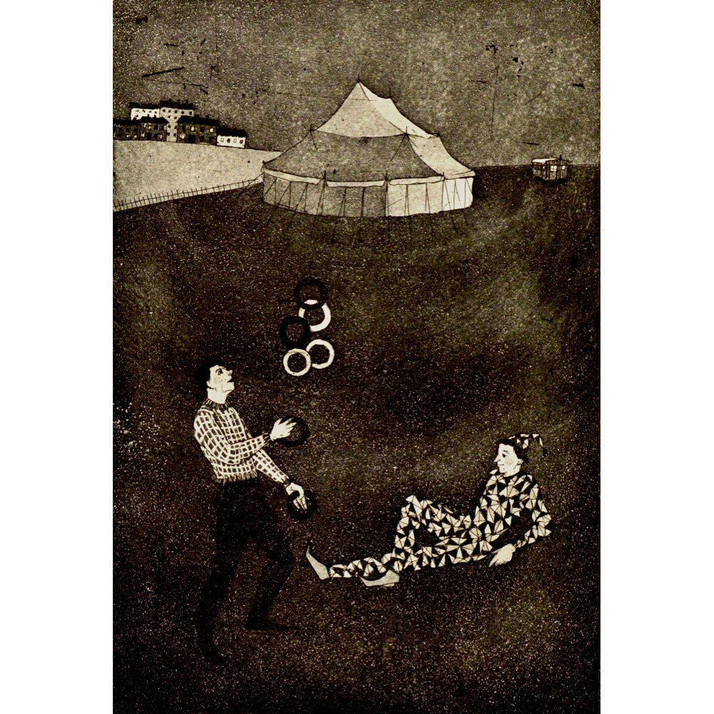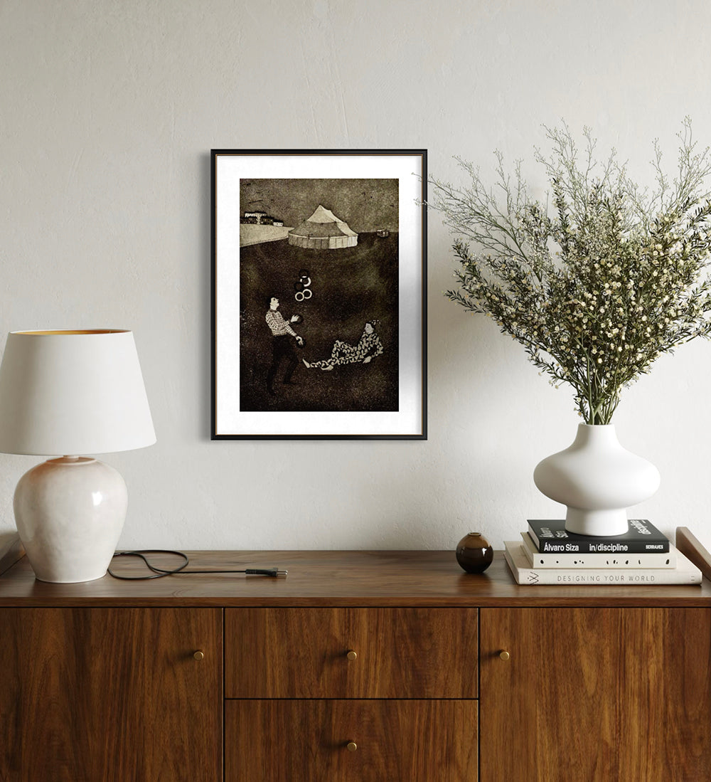 A subterranean, atmospheric look at the circus through the lens of mid-century Hungarian modernism. Lóránt Nyári utilizes the deep, velvety blacks inherent to the etching process to carve a figure out of the darkness, focusing on the kinetic relationship between the performer and the five suspended spheres. The composition is stripped of spectacle, offering instead a quiet, psychological portrait of concentration where the heavy tonal contrast emphasizes the isolation and grace of the subject.