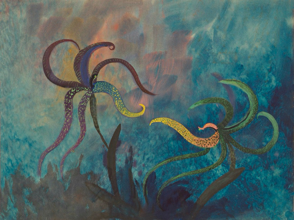 This 1917 composition by Janus de Winter presents a dramatic, ethereal interpretation of the botanical world. Rather than a static study, the piece captures a sense of movement and psychic energy, with the orchids appearing to grapple against a deep, shifting background. The atmosphere is heavy and immersive, balancing a dark, visceral intensity with the delicate, almost spectral luminosity of the petals. It offers a viewing experience that feels less like a garden scene and more like a glimpse into a private, emotional landscape.