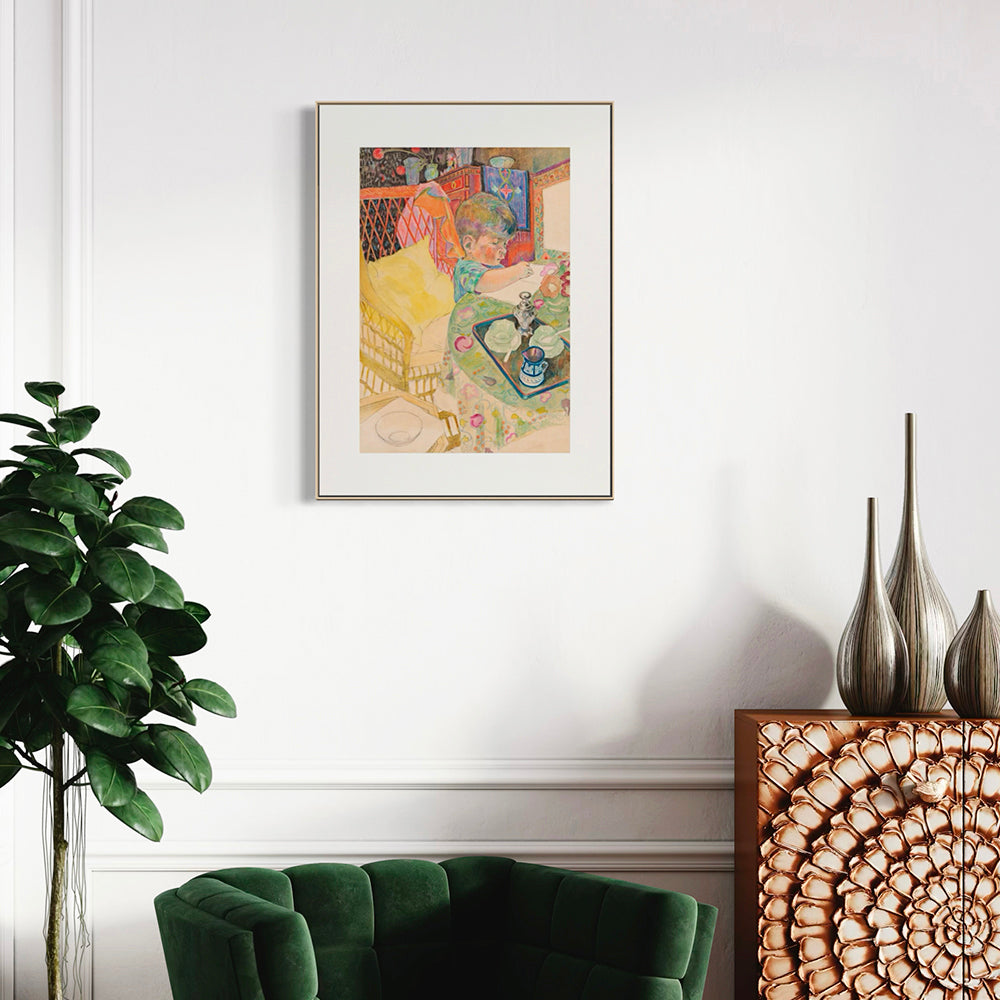 The work is a compelling example of how Verhagen balanced the structural influence of the Dutch Decadent movement with a more intimate, impressionistic approach to family life. The composition is notably dense, featuring layered patterns—from the wicker chair’s lattice to the floral tablecloth and the geometric textile in the background—yet it remains grounded by the central figure of the child. The choice of medium allows for a delicate, textured application of color that creates a rhythmic "swarming life" across the surface, a hallmark of Verhagen’s more mature, organic style.