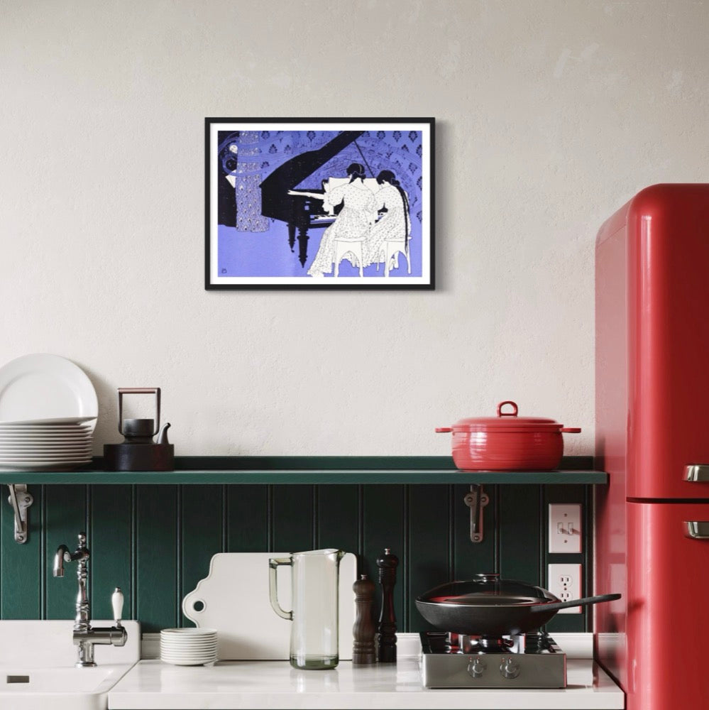 Two young women sit side by side at a grand piano, their delicate figures bathed in lilac tones and black silhouettes. The composition feels both intimate and quietly humorous, their synchronized posture a reflection of grace, domestic ritual, and faint rebellion. The patterned backdrop and evening dress details draw the viewer into an atmosphere that’s both genteel and lightly satirical—a glimpse of bourgeois refinement through a modernist lens.