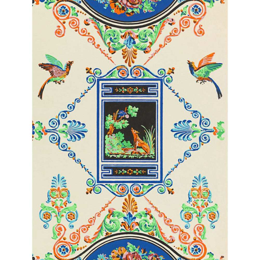 This sidewall’s technical precision and visual rhythm reflect the highest achievements of block printing in its era. Its crisp delineation and balanced ornamentation show the mastery required to register nine separate colors on a continuous roll. The contrast of dark central imagery with lighter botanical flourishes underscores the moral duality of the fable itself, flattery and deception framed within beauty and order.