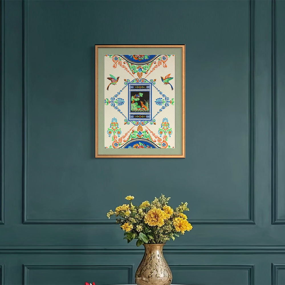 Produced around 1840, this design embodies the neoclassical influence that dominated Western decorative arts in the decades following the Napoleonic period. The Greek Revival aesthetic marked by palmettes, scrolls, and geometric symmetry—expressed ideals of rationality and moral clarity, aligning perfectly with Aesop’s enduring fables. During this time, such wall coverings were both artistic statements and indicators of cultural literacy, turning domestic interiors into visual narratives of virtue and civility. The medallion format echoes ancient friezes, blending mythological storytelling with industrial craft.