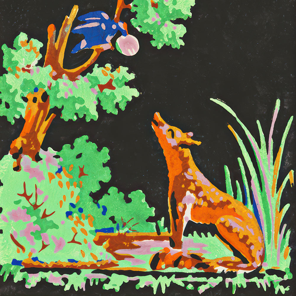 Rendered in the Greek Revival style of the early 19th century, The Fox and the Crow transforms a familiar moral tale into a decorative allegory. The central medallion frames the cunning fox and vain crow against a rich black ground, surrounded by vines, blossoms, and classical motifs. The symmetry and polish evoke refinement and restraint, while the nine-color printing—orange, brown, blue, black, and lavender creates quiet visual depth on the white satin ground. The result feels at once ornamental and narrative, bridging myth and design.