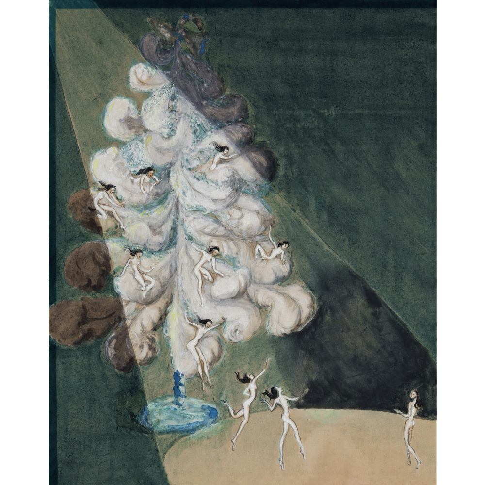 This work is compelling for its mastery of light and texture. The leftward ray not only guides the eye across the scene but also gives the impression of a tangible atmosphere, while the soft plumes add movement and depth.The subtle use of beige and muted tones creates a harmonious palette, allowing the figures to emerge with a quiet, ethereal presence. The layered arrangement of nymphs introduces an intriguing interplay of space and form.