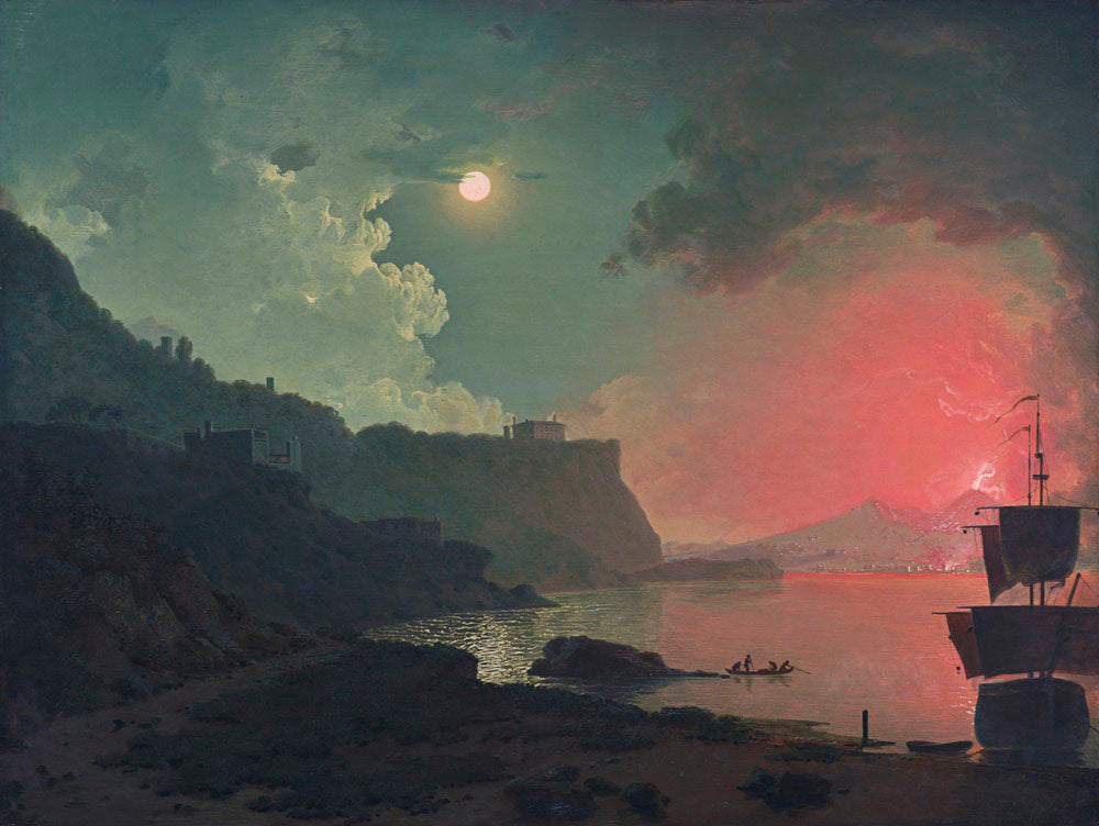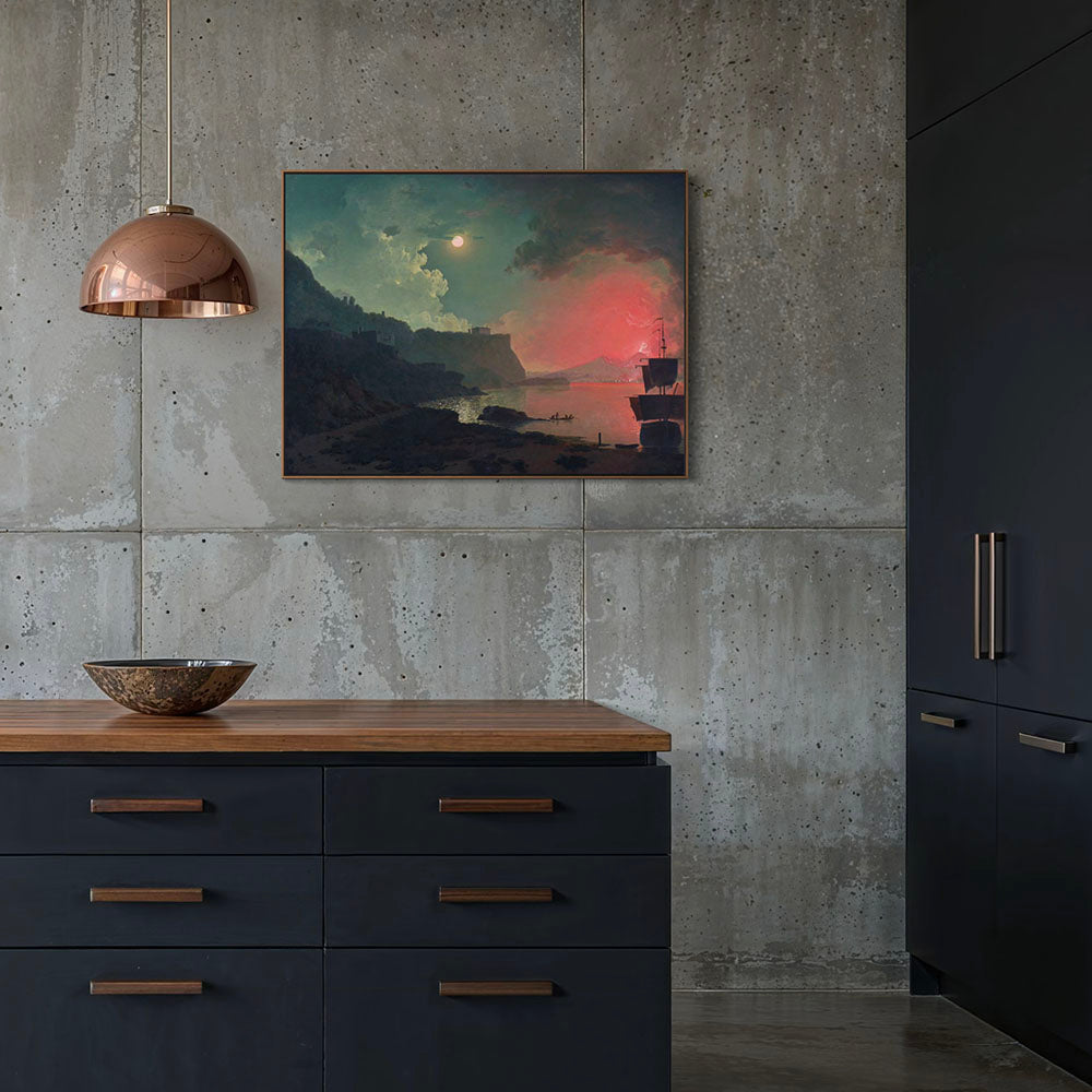 A breathtaking study of elemental contrast, pitting the ethereal, cool light of a full moon against the violent, incandescent roar of an erupting volcano. Painted circa 1788, the work captures the Bay of Naples from a distant, elevated vantage point, where the tranquil silhouettes of the coastline are disrupted by a towering column of fire and ash. The atmosphere is one of profound awe, inviting the viewer to witness a "sublime" spectacle where the quietude of the night meets the untamable power of the earth.