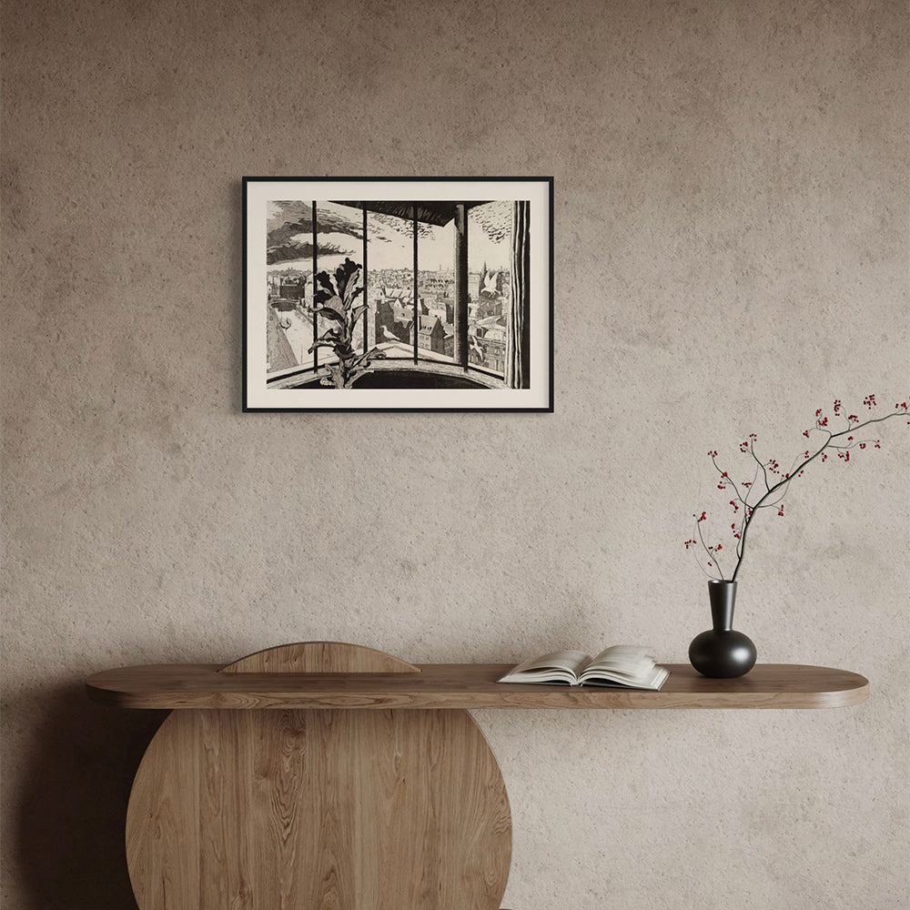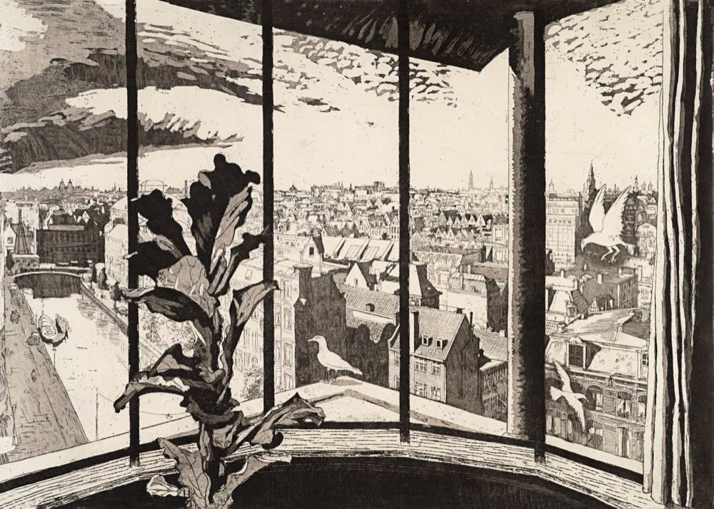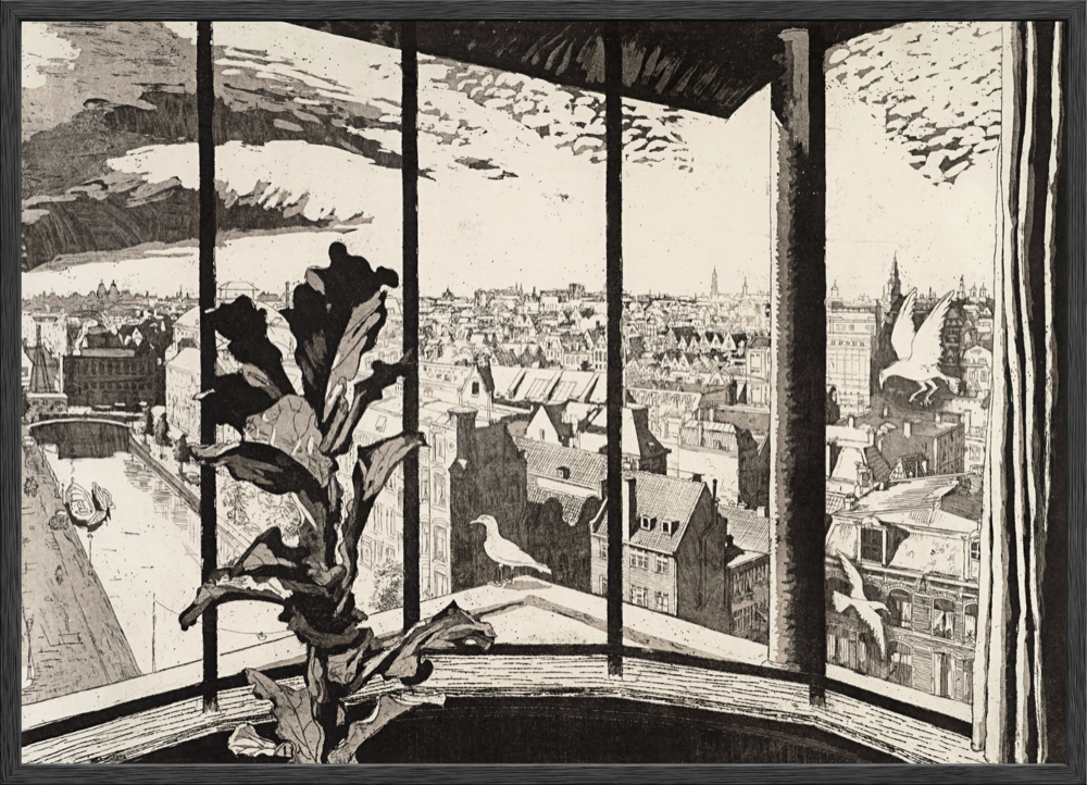 From the upper floor of Amsterdam’s Weesperplein Hospital, a quiet yet complex view of the city’s southern canals. The composition unfolds in soft aquatint tones, where rooftops, waterways, and bridges emerge through a delicate balance of geometry and haze. The print’s restrained palette and atmospheric depth evoke a moment of stillness amid the urban rhythm, a view both intimate and architectural.