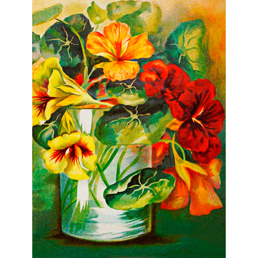 This soft, painterly illustration celebrates the humble nasturtium, whose very name tells a warrior's tale. Tropaeolum, from the Greek "tropaion" meaning trophy references ancient battlefields where victorious soldiers hung captured shields and helmets on trees. Early botanists saw this same imagery in nasturtium flowers: the round leaves like shields, the spurred blooms like golden helmets. This martial heritage made nasturtiums the flower of conquest and patriotism in Victorian symbolism, though gardeners loved them for more practical reasons their peppery leaves enlivened salads, and their trailing habits softened harsh garden edges with cascades of sunset colors.