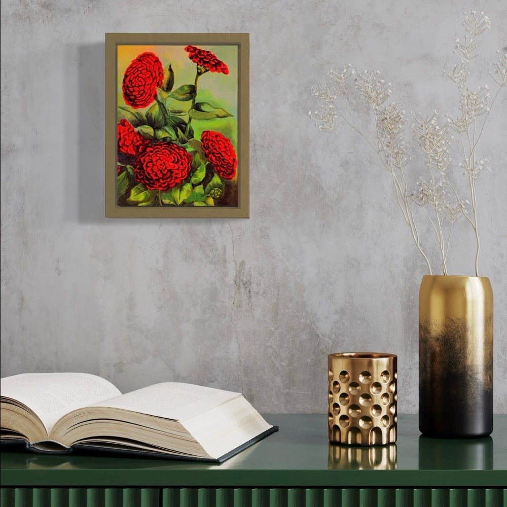 These deep crimson zinnias echo the romance of their namesake rose 'Général Jacqueminot' (France, 1853), a beloved variety that graced Victorian gardens. The practice of borrowing prestigious rose names for seed catalog descriptions was common marketing in the 19th century, lending glamour to humble annuals. This detailed lithographic print captures the zinnia's architectural beauty—each petal precisely layered like a dancer's ruffled skirt. Zinnia elegans, originally from Mexico, became the workhorse of Victorian cutting gardens, blooming tirelessly from summer until frost. In the coded language of flowers that governed Victorian sentiment, zinnias whispered of distant friends, making them perfect for pressed flower albums and farewell bouquets.